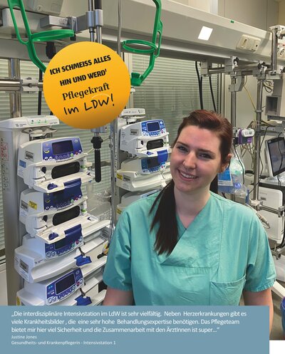 „Die interdisziplinäre Intensivstation im LdW ist sehr vielfältig. Neben Herzerkrankungen gibt es viele Krankheitsbilder, die eine sehr hohe Behandlungsexpertise benötigen. Das Pflegeteam bietet mir hier viel Sicherheit und die Zusammenarbeit mit den Ärztinnen und Ärzten ist super“, sagt Justine Jones, Gesundheits- und Krankenpflegerin auf der Intensivstation 1 im Klinikum Links der Weser.