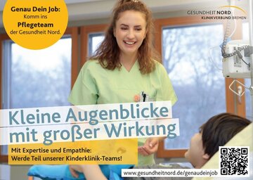 Wie schön, dass du vorbeischaust! Auf dieser Seite geben dir Kolleginnen und Kollegen einen genaueren Einblick in die Pflegeteams unserer Kinderkliniken. Neben dem Eltern-Kind-Zentrum Prof. Hess am Klinikum Bremen-Mitte - einem der größten Kinderkrankenhäuser Deutschlands - haben wir auch im Klinikum Bremen-Nord eine breitaufgestellte Klinik für Kinder- und Jugendmedizin. Vom Frühgeborenen bis zum Heranwachsenden versorgen wir hier alle Altersgruppen und praktisch alle Erkrankungen, die im Kinder- und Jugendalter auftreten können. Werde auch Teil unserer Teams. Hier findest du alle wichtigen Infos, die für deine Bewerbung wichtig sind.