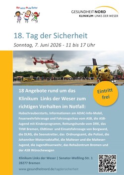 Am 7. Juni 2026 ist es wieder soweit: Der Tag der Sicherheit findet zum 18. Mal statt und bietet Ihnen die Gelegenheit, sich rund um das Thema „Notfall! Was tun?“ zu informieren. Von 11:00 bis 17:00 Uhr erwartet Sie am Klinikum Links der Weser ein umfangreiches Programm, bei dem mehr als 100 Rettungsprofis ihr Wissen und ihre Erfahrungen teilen. Der Eintritt zu dieser spannenden Veranstaltung ist selbstverständlich kostenlos.